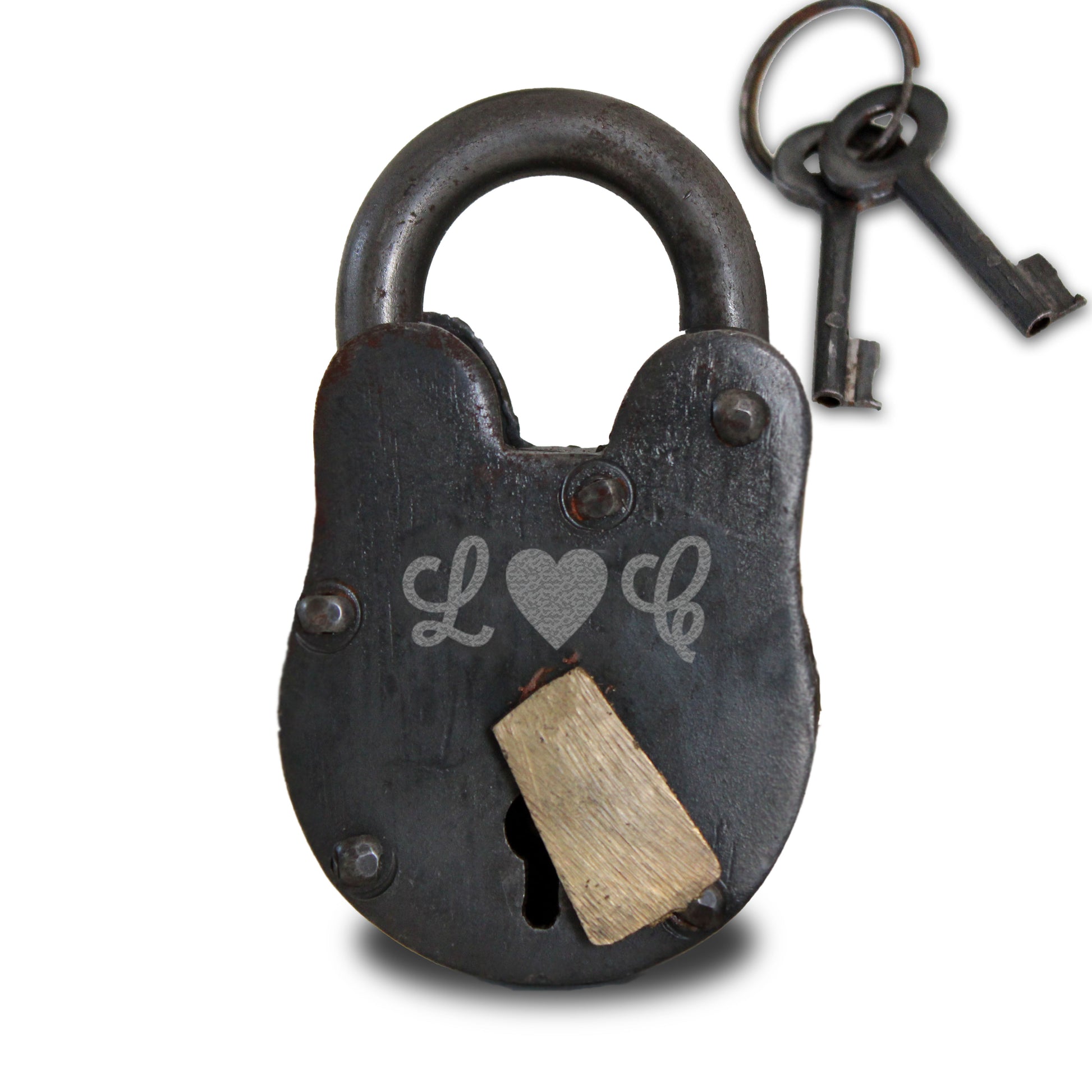 EtchThisOut's engraved love lock is perfect for any couple swearing their eternal love for each other. The lock is fully functional and comes with two mini keys that can open and lock this special keepsake. This antique lock lock measures 3″ tall, 1-5/8″ wide, and .75″ thick It comes with 2 keys measuring 1.75″ long. Our locks are engraved using a high precision laser. Please note, this item is engraved on one side only.