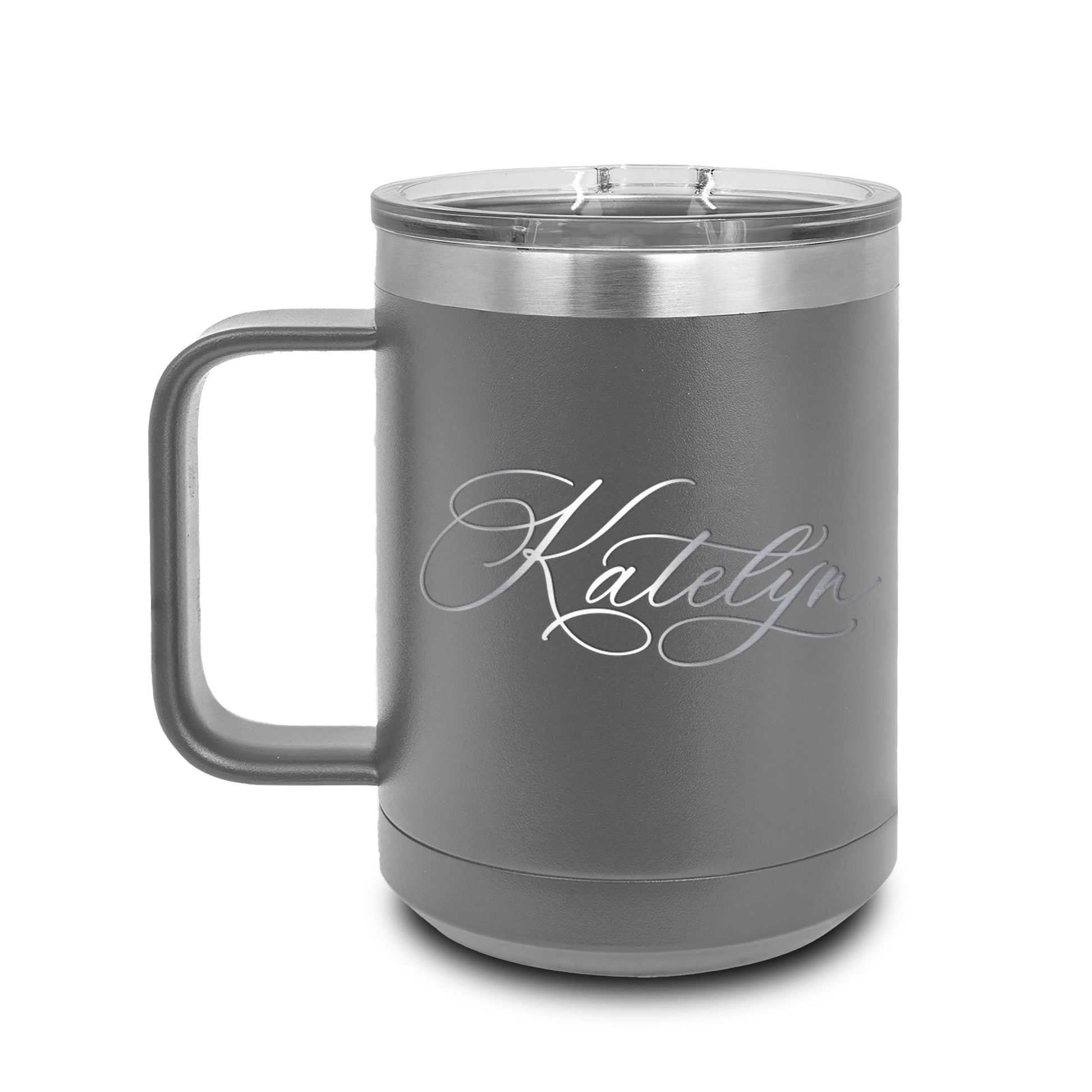 Our insulated stainless steel coffee Mug Tumblers feature double-wall, vacuum insulation with a clear, slider lid. They are 2X heat and cold resistant compared to other tumblers and are made from 18/8 gauge stainless steel. The stainless steel is powder coated with the color of your choice of laser engraved design.