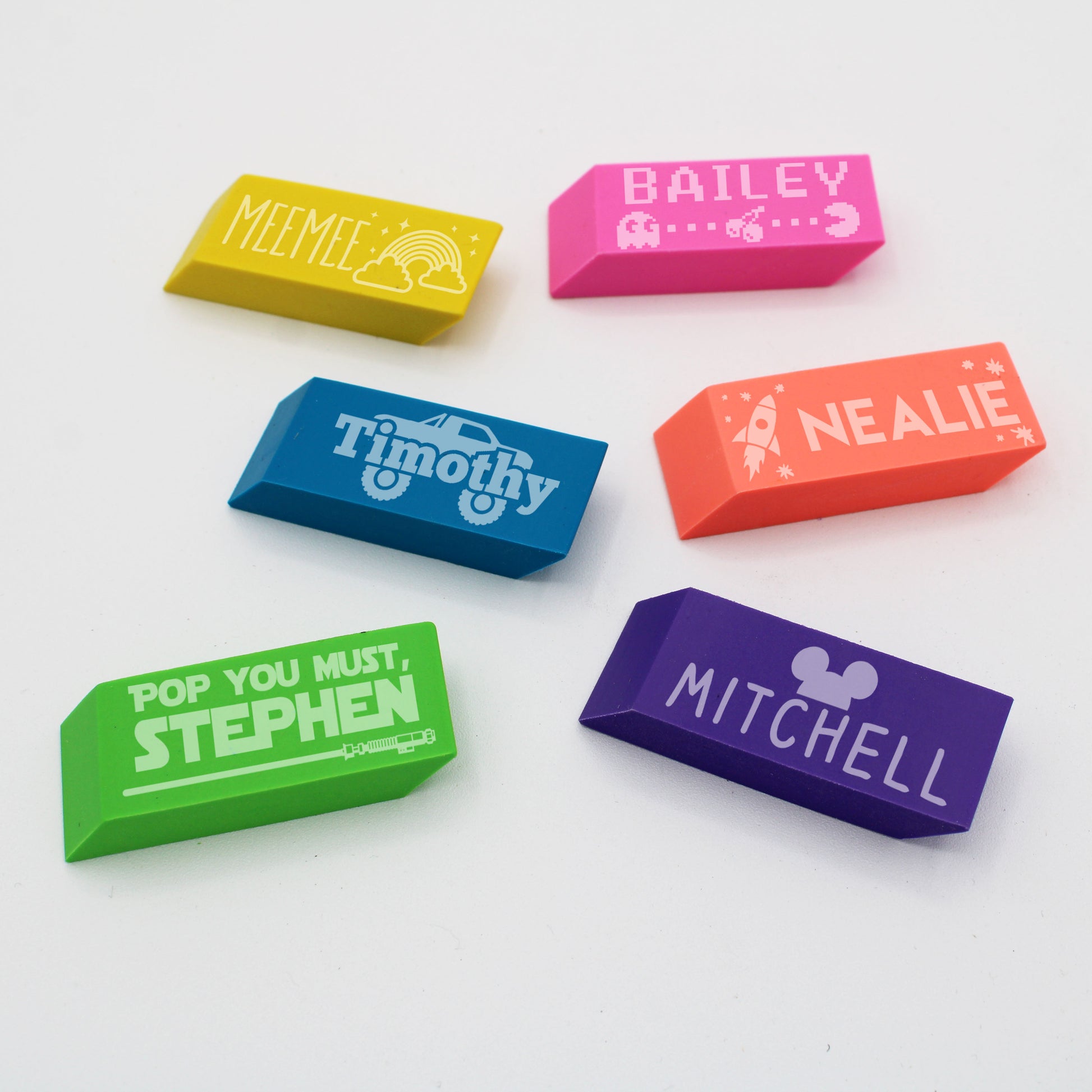 What a fun addition to your school supplies this year! Pink Erasers are always on the back-to-school list, why not make it a little more fun? This listing includes a pack of 3 Pink Erasers personalized with your kiddo's name. These personalized erasers are laser engraved so the engraving will never fade or wear off.